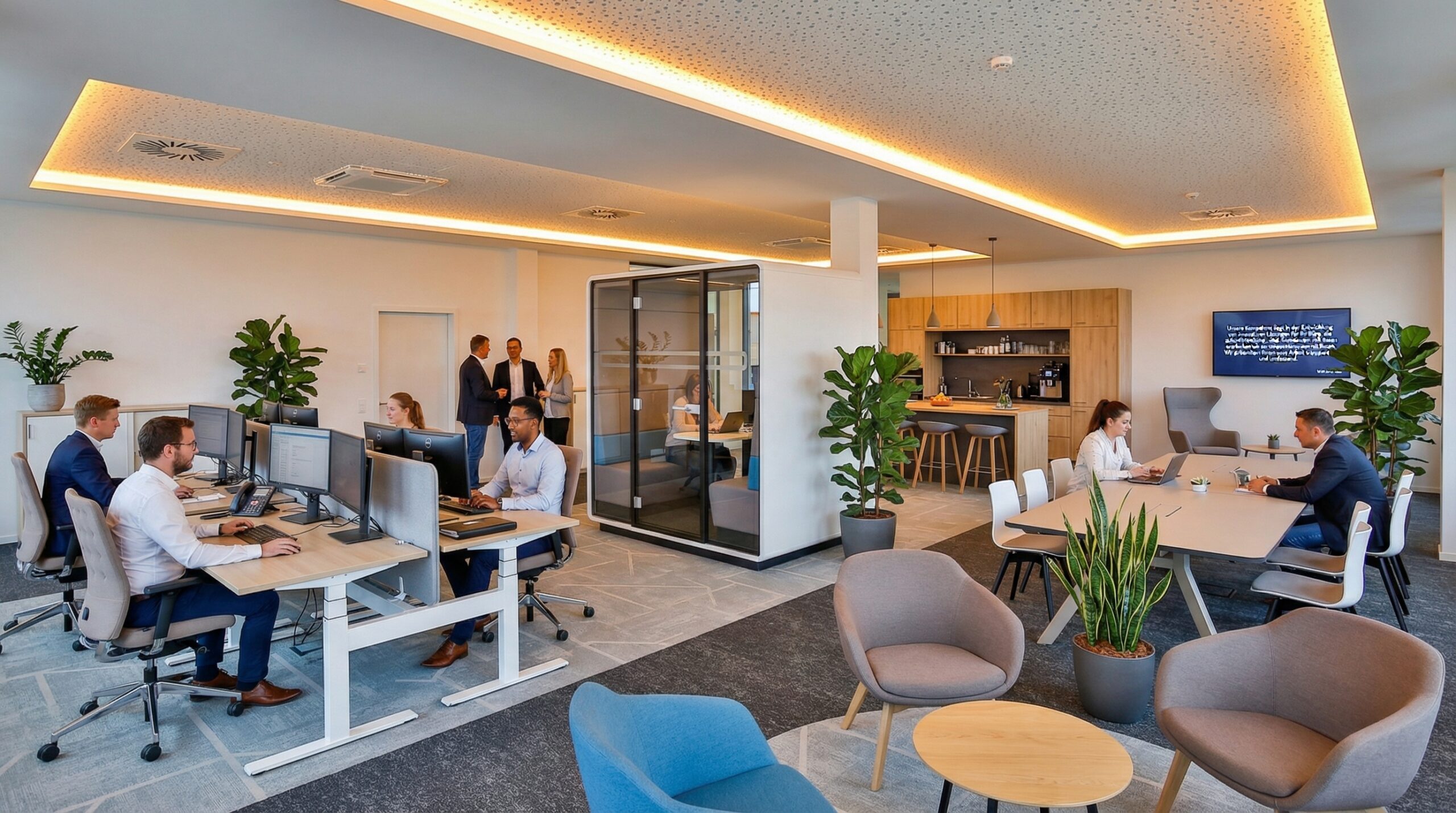 Dabei legen wir besonderen Wert auf eine ganzheitliche Betrachtung, die Raumakustik, Beleuchtung und eine ansprechende Gestaltung integriert, um ein produktives und angenehmes Arbeitsfeld zu schaffen.